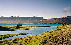Haukadalsós: Þorbjörn súrr (sour-milk) and his family arrived in Iceland and sailed their ship into the Haukadalsós estuary here, according to Gísla saga. As the tide ebbed, the ship was gently deposited on the sandy bottom, where the cargo could be unloaded with dry feet. |